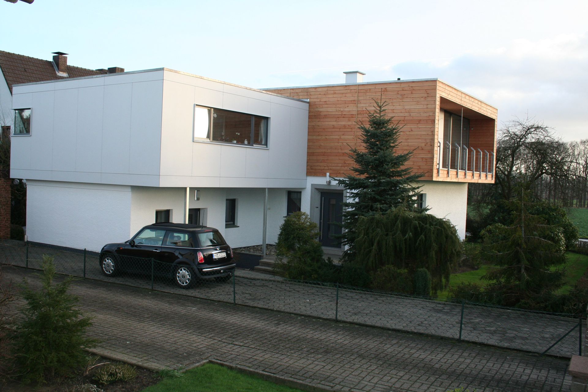 Der neue Unterstand für PKW und Abstellraum ermöglicht den "trockenen" Zugang zum Gebäude.