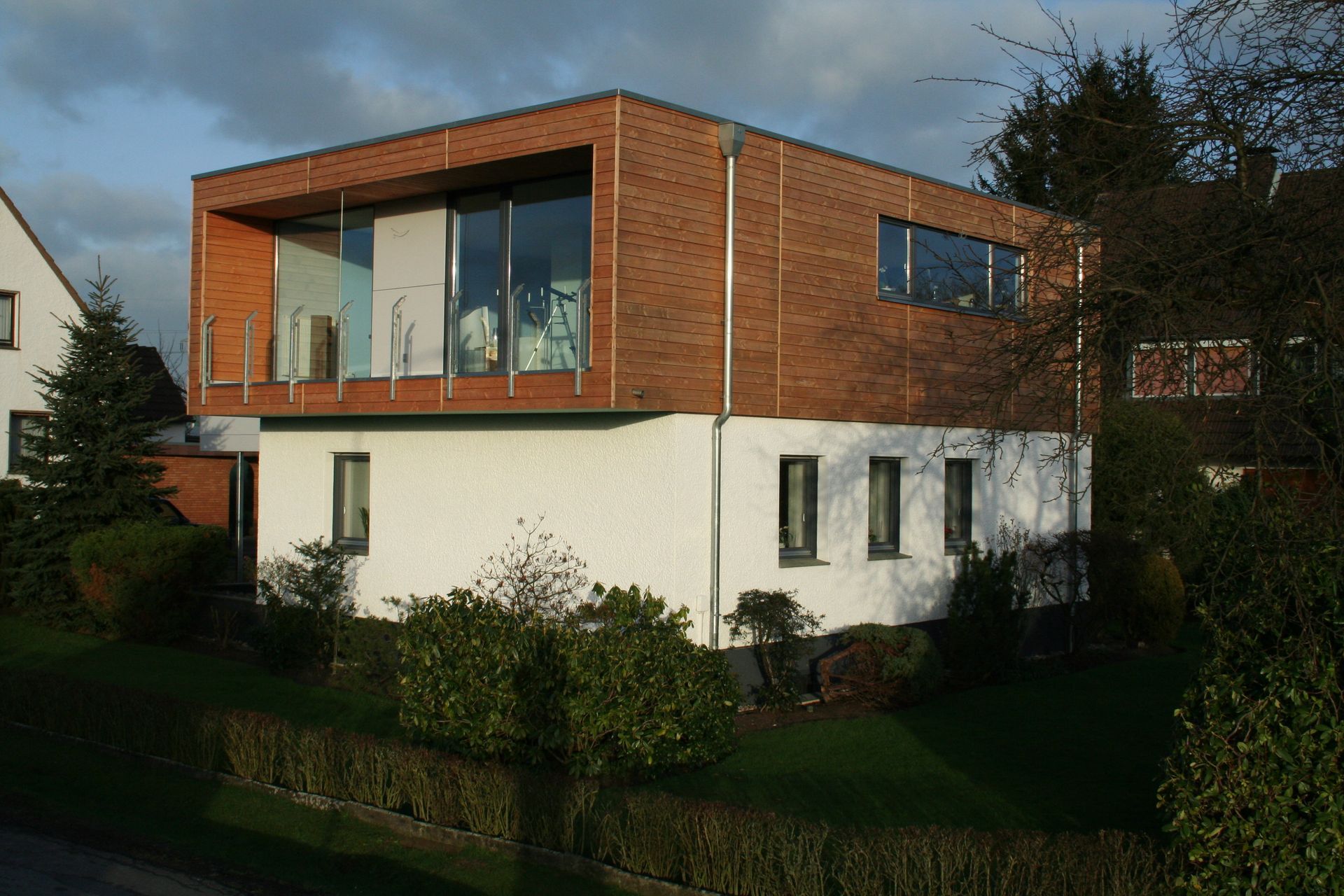 Durch den Neubau zweier ineinander geschobener Kuben entstand ein modernes, klar strukturiertes Zweifamilienhaus. Das während der kurzen Bauphase bewohnte Erdgeschoss blieb von den Baumaßnahmen weitgehend unberührt. Dagegen wurde das bestehende Satteldach komplett abgetragen und durch den vorgefertigten, in Holzrahmenbauweise errichteten Flachdachbau aufgestockt.