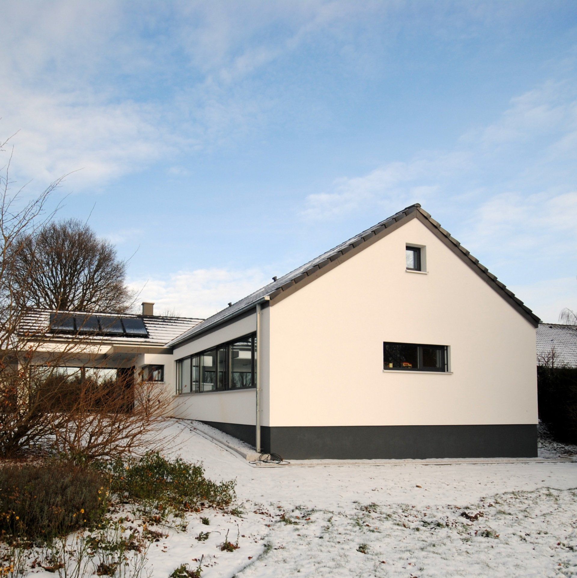 Der Bestandswinkelbungalow wurde komplett entkernt und teilweise zurückgebaut. Die Neugestaltung des Gebäudes ermöglicht hochwertiges, großzügiges und offenes Wohnen mit hochwärmedämmender Gebäudehülle und Gebäudetechnik mit zentraler Lüftungsanlage und Luftwärmepumpe auf ca. 180 m² Wohnfläche.