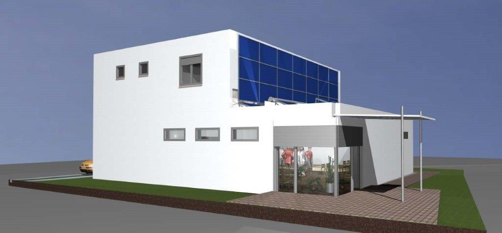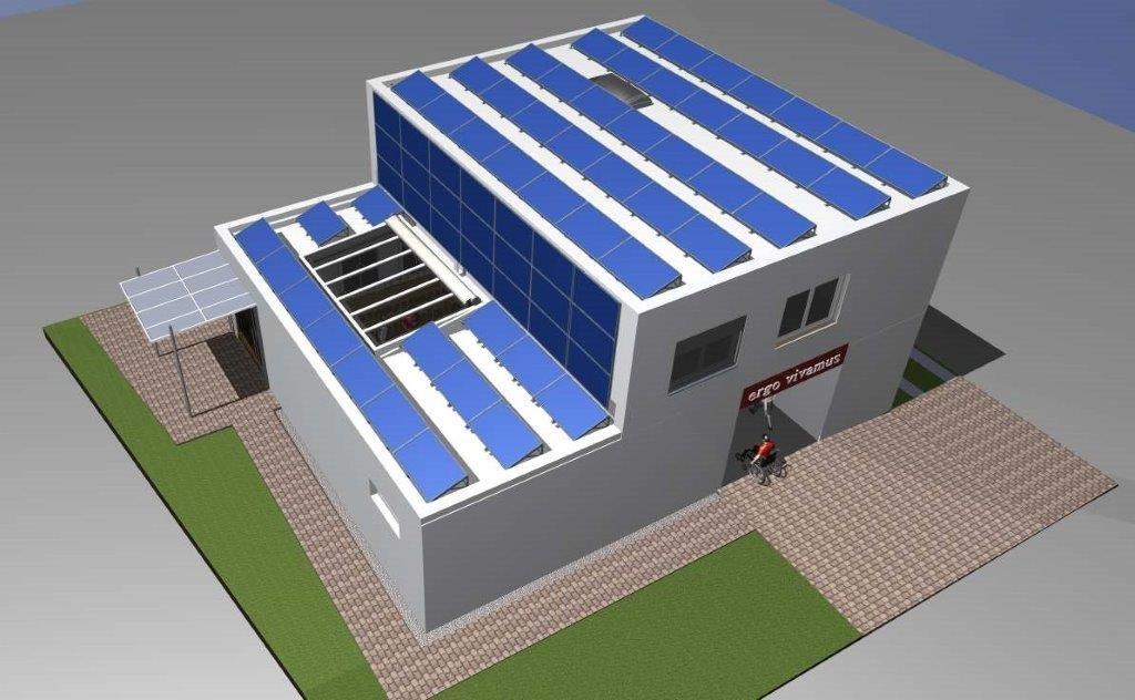 Die moderne Haustechnik (Luftwärmepumpen) mit Photovoltaik-Paneelen an Fassade und auf dem Dach sind ein weiterer Beitrag zur energetischen Autarkie.